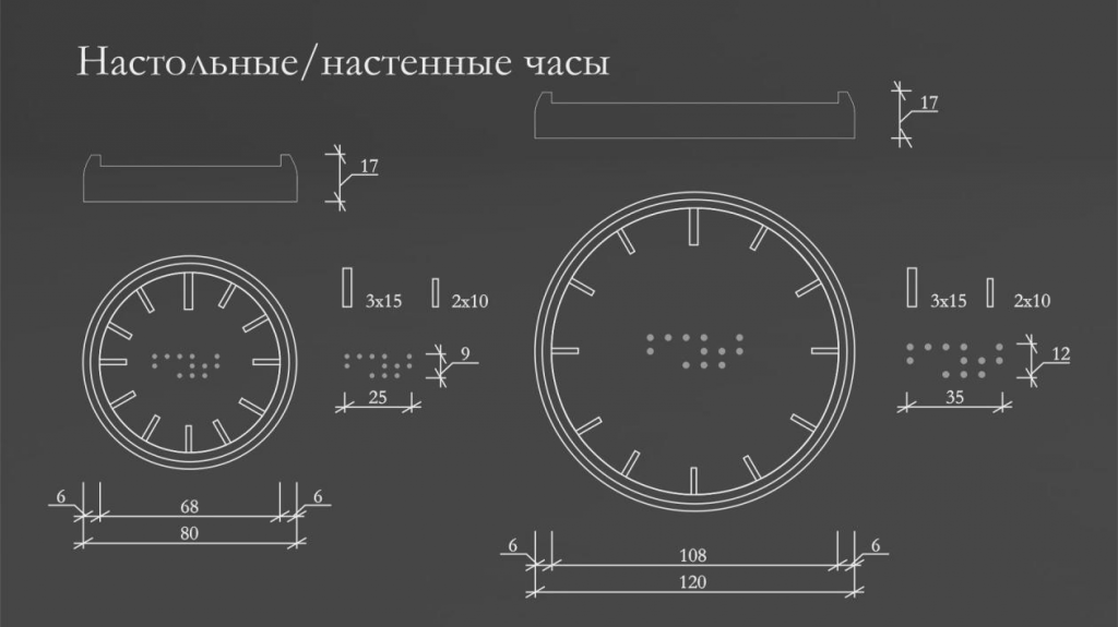 Обычные часы для незрячих людей озвучивают время, а наши хороши тем, что и слепоглухой человек тоже сможет определить по ним время. Сделать это помогает вибрация: на циферблате расположены насечки, по которым нужно провести пальцами. Единовременная вибрация означает количество часов, двойная — количество минут. Даже многие зрячие люди говорили, что хотят носить такие часы — они действительно стильно выглядят. Часы представлены в трех вариациях: наручные, карманные и настенные. Стоимость наручных часов — 7 тысяч рублей.