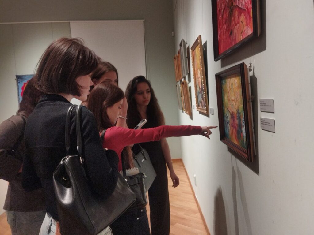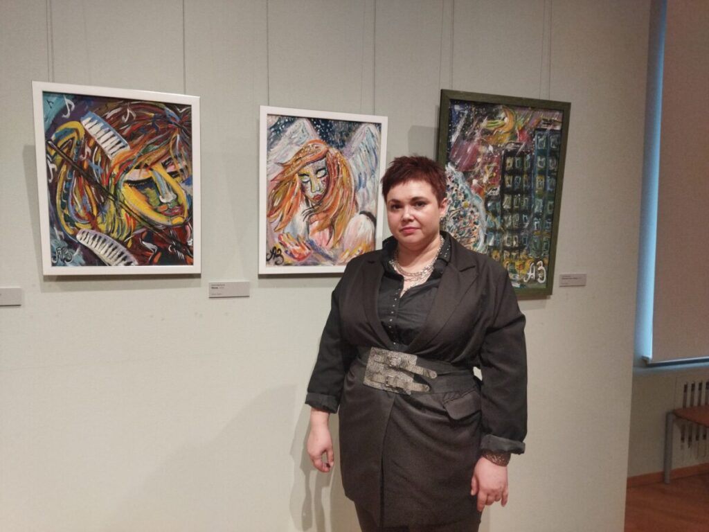 Одна из художников, картины которых представлены на выставке «Пределы восприятия — SOSтояние», — Арина Задорожняя — участница проектов НГХМ и организации «Новые возможности».