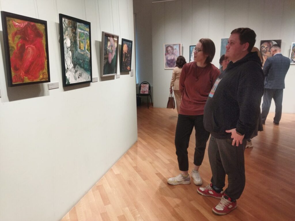 Посетители выставки с интересом рассматривают работы, и многим даже не приходит в голову, что они — творения людей с ментальными особенностями.