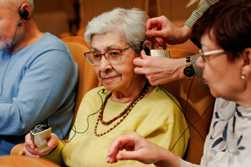Полчаса назад в еще пустующий зал зашли главные зрители спектакля — люди с нарушениями зрения. Для них двери театра открылись чуть раньше: таким зрителям нужно больше времени, чтобы сориентироваться в пространстве, обустроиться на своих местах и получить оборудование. Особых зрителей встречают сотрудники театра — оборудование нужно настроить и проверить, а также объяснить нюансы работы с ним.