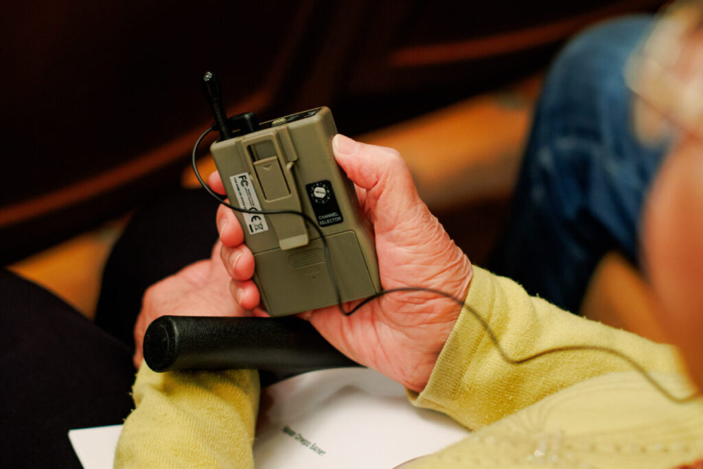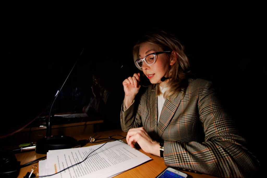 Физически тифлокомментатор работает либо рядом со звукооператорами, либо со специалистами по свету. Как вариант – на балконе. Тифлокомментатор не просто читает текст, но и следит за ходом спектакля. Важно помнить, что особые зрители слышат вас через специальное оборудование. Причем, через один наушник. То есть, они одним ухом слушают то, что происходит на сцене, а другим — тифлокомментарий.