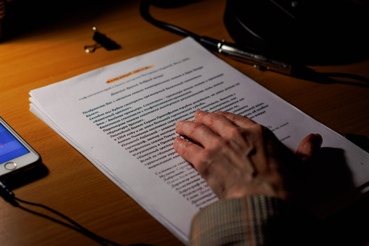 Тифлокомментатор Марина Нестеренко проверяет оборудование и заметно нервничает — на самом деле премьера сегодня именно у нее. Последний и, наверное, самый непростой балет Сергея Прокофьева «Каменный цветок», поставленный по мотивам сказов Павла Бажова, впервые покажут с профессиональным тифлокомментированием.
