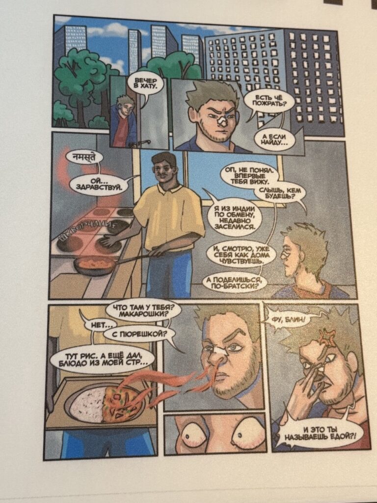 Этноцентризм — это мировоззрение, при котором собственная культура воспринимается как образец, а все другие кажутся «неправильными». Именно это переживает герой комикса в начале, пока не сталкивается с внутренним конфликтом: «это все вокруг странные или со мной что-то не так?». И после — ищет выход из лабиринта культурных различий.