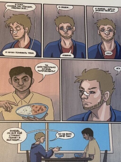 «Я пока, скажем так, отходил, обдумал все… И начал понимать тебя. В общем… Извини. И знаешь — дай-ка заценю твой дал», — говорит он в конце комикса.