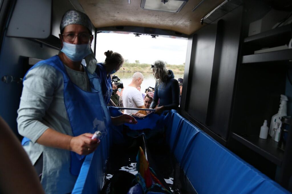 На берегу животному обработали раны, ввели антибиотики, удалили впившиеся крючки и лески. Особую тревогу вызывали несколько глубоких ран на боку со всеми признаками начавшейся инфекции, поэтому к транспортировке приступили только с разрешения ветврача.