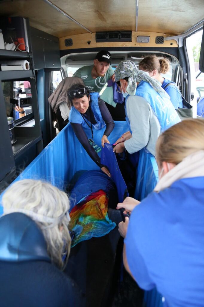 Для перевозки зоозащитники использовали специальную ванну, но Бейсуженка оказалась крупнее, чем предполагалось. Весь путь — 4,5 часа — Татьяна Белей находилась с афалиной в транспортировочной ванне, чтобы уберечь ее от возможных повреждений, но с выпуском в море медлить было нельзя.