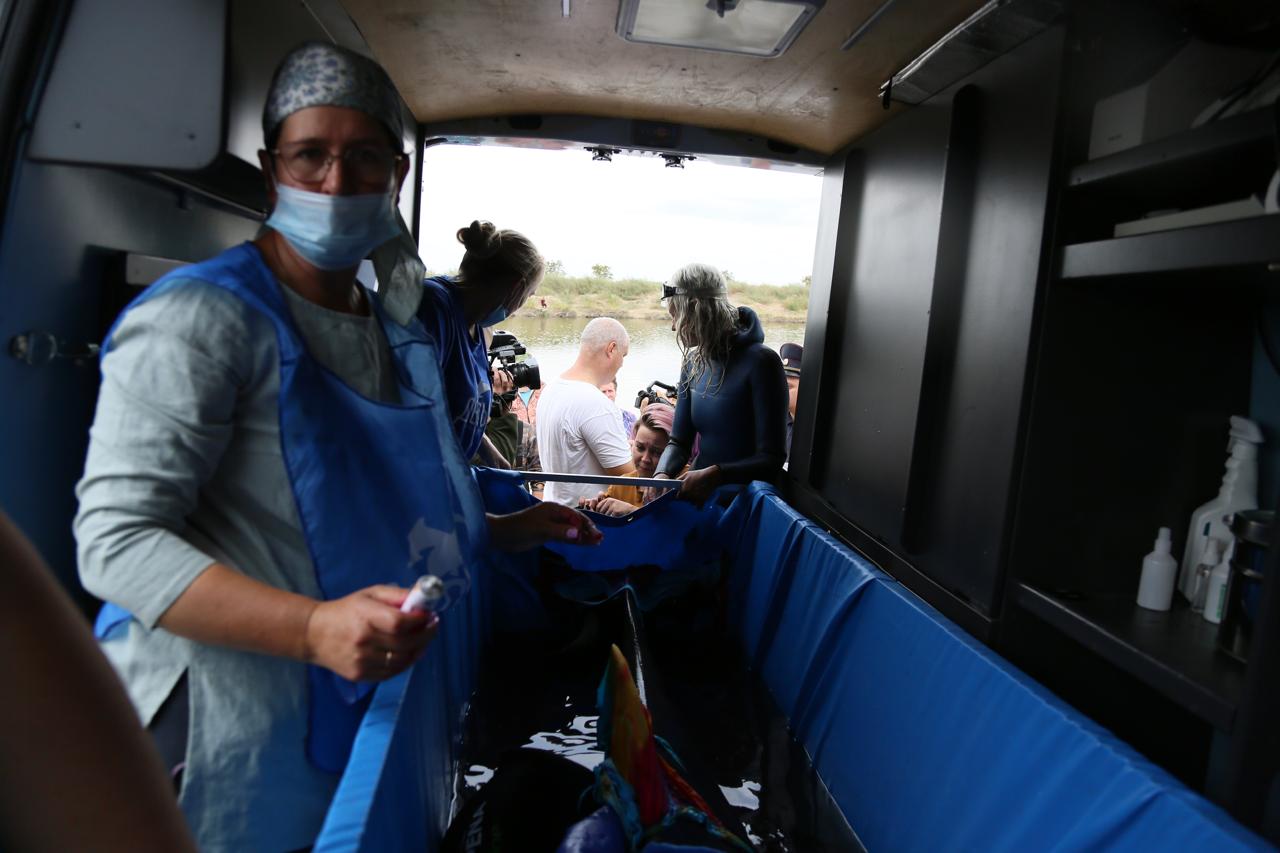 На берегу развернули полевой госпиталь, где животное ждала главный ветврач «Дельфы» Татьяна Денисенко, специально прилетевшая из Москвы. С Бейсуженки не сводили глаз, ведь поведение стрессующего животного непредсказуемо, каждый этап операции таил опасность. Самый страшный момент наступил, когда дельфин, испугавшись мели, резко рванулся в сети и запутался.