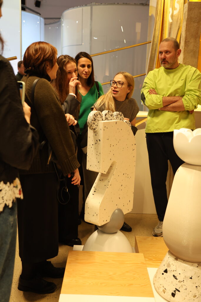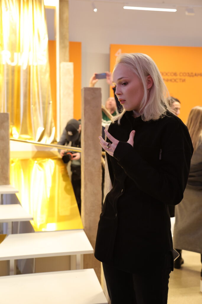 Куратор и режиссер проекта Дария Женихова предупредила первых гостей: «Забудьте, что вы на открытии, что вы взрослые люди. Я вас призываю: попробуйте все сами! Пройдите тропу палеофитнеса, выследите доисторическое животное, поиграйте в стрелялки из ватных палочек».