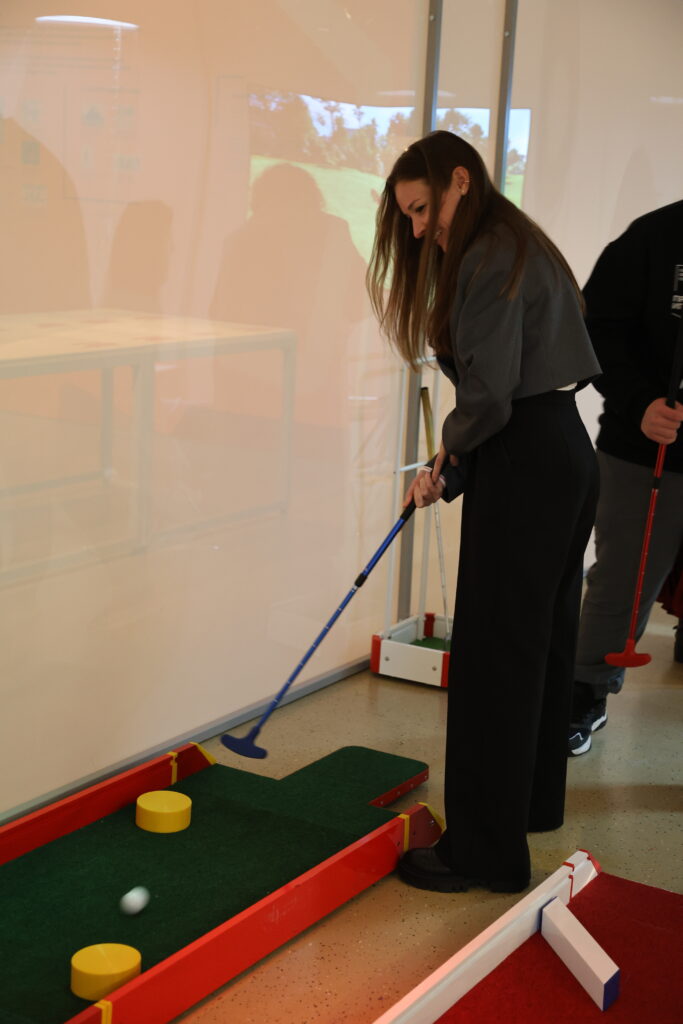 На этой экспозиции можно не только поиграть с мячом, но и попасть в будущее. Все благодаря диджитал-гольфу, в котором виртуальные удары соединяются с реальными движениями: сначала игрок делает попытки на игровой консоли, а затем выходит на реальное мини-поле. Общий результат складывается из цифрового и физического и фиксируется в чат-боте.