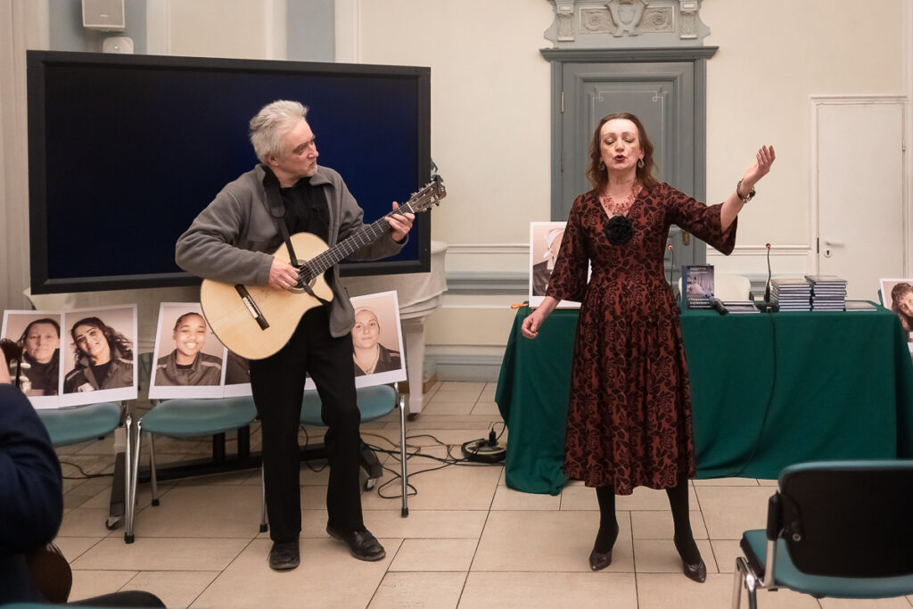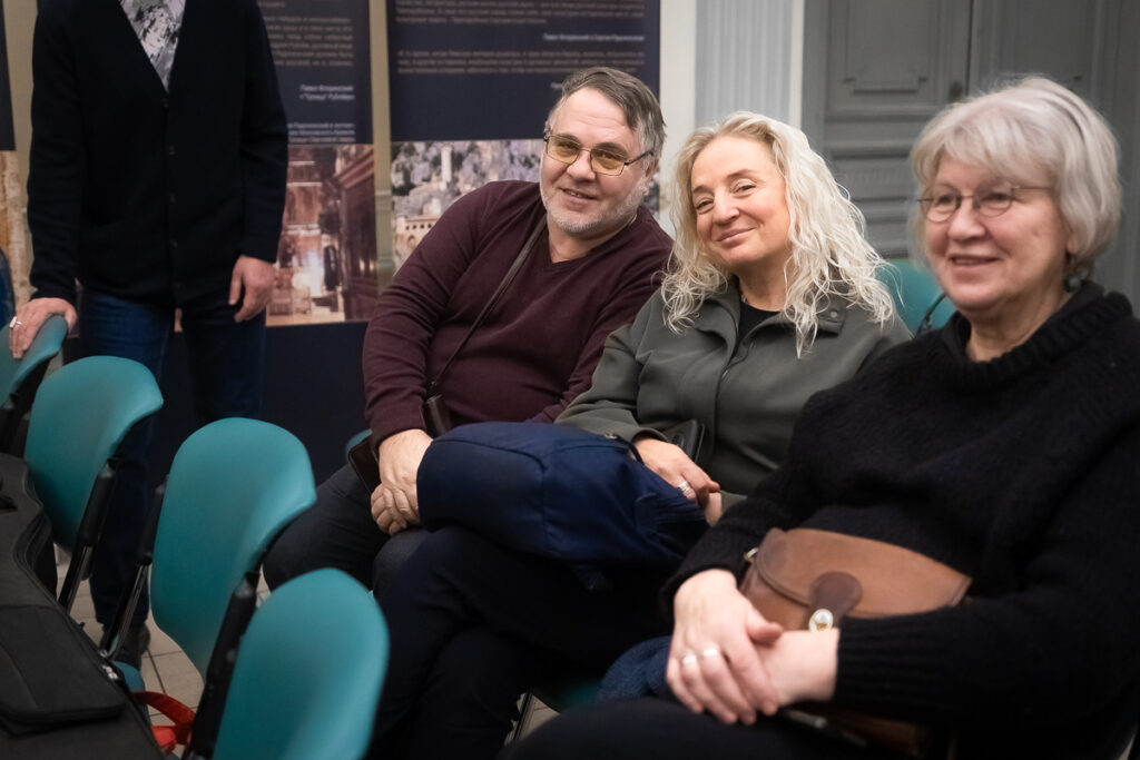 Гитарист Владимир Гочуа, редко исполняющий песни сам, даже в этом зале в центре Москвы, оборачиваясь на фотографии, предупреждает: «Глядя на эти лица, могу и не спеть…» Но поет. Песню на свои стихи — о «безгрешных», которые «камнями кидаются».