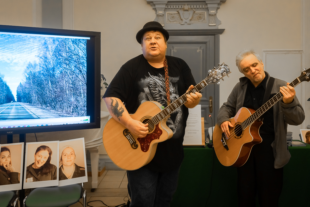 Гитарист Владимир Гочуа, редко исполняющий песни сам, даже в этом зале в центре Москвы, оборачиваясь на фотографии, предупреждает: «Глядя на эти лица, могу и не спеть…» Но поет. Песню на свои стихи — о «безгрешных», которые «камнями кидаются».