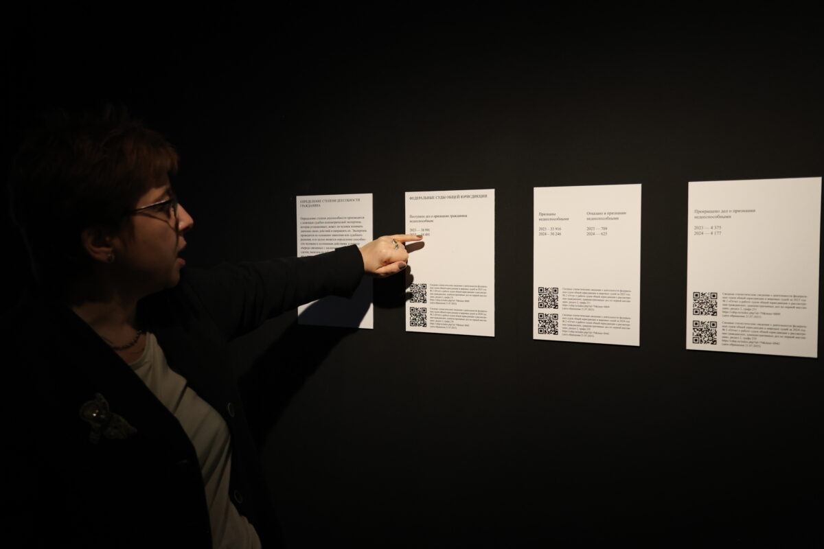 Выставка состоит из нескольких разделов. Первые залы — темные, рассказывают про будни в ПНИ. В одном представлена история человека, который прожил в ПНИ более 10 лет и даже не знал, что был лишен дееспособности.