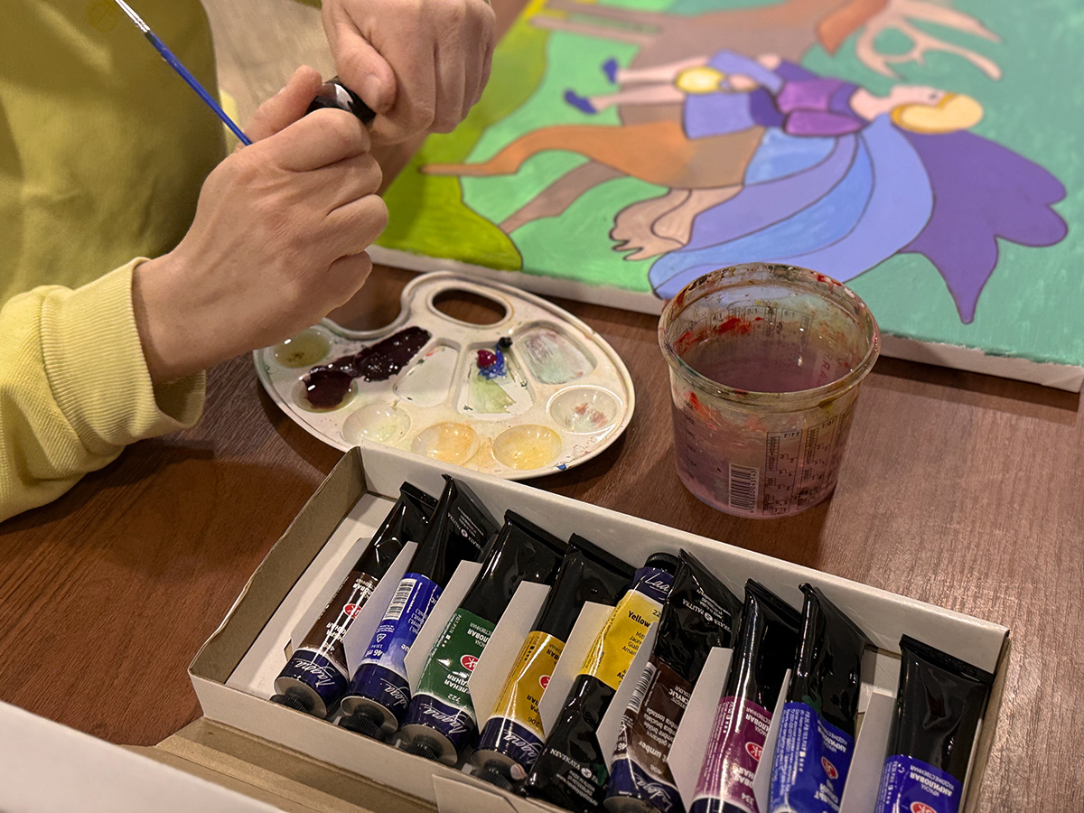 Сразу из прихожей можно попасть в просторное помещение. Это – художественная мастерская, в которой в день нашего приезда идет активная работа. Несколько мастеров аккуратно выводят линии, смешивают цвета на палитре, дорабатывают детали.