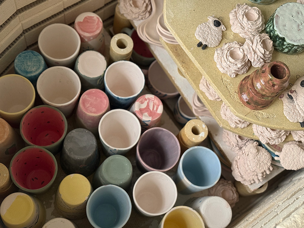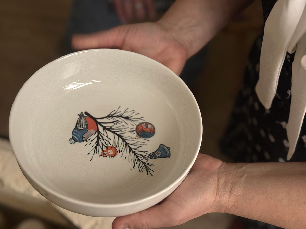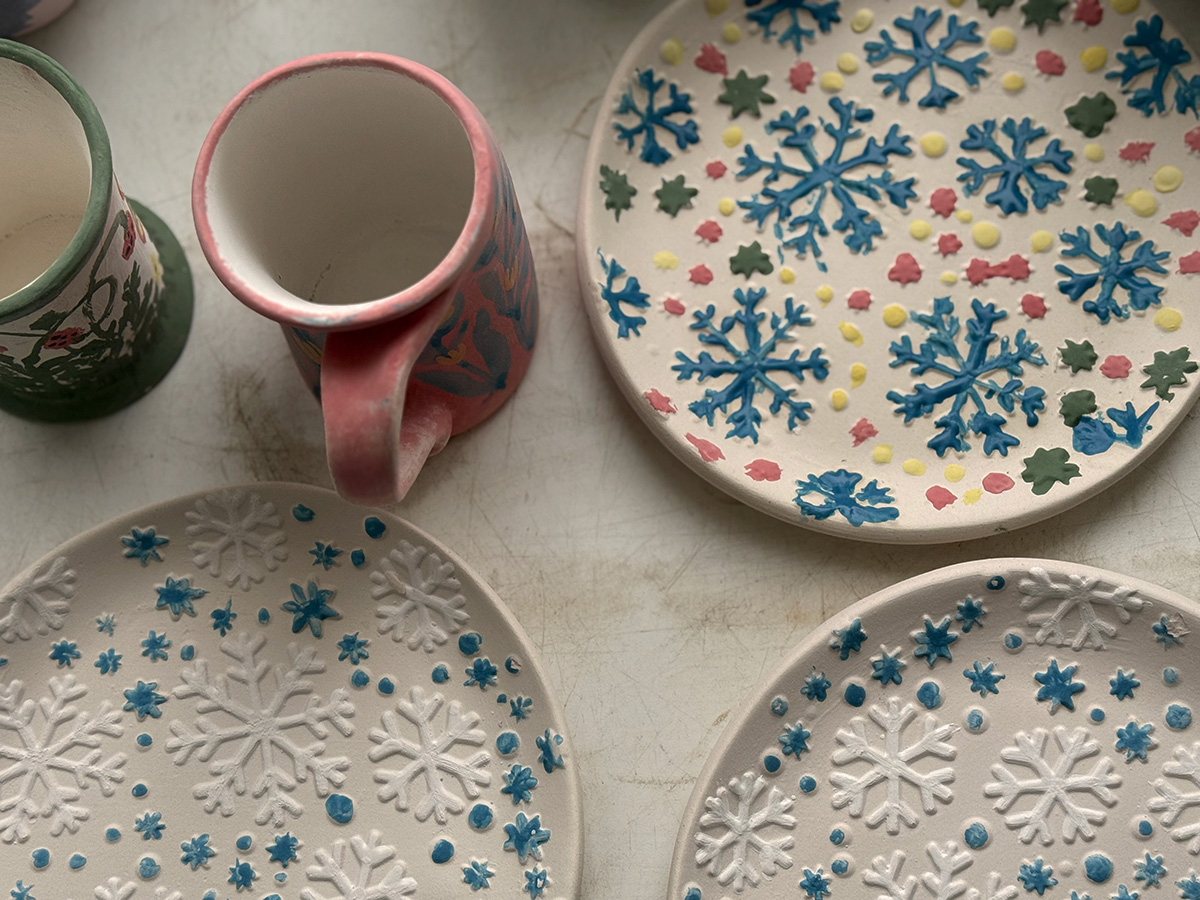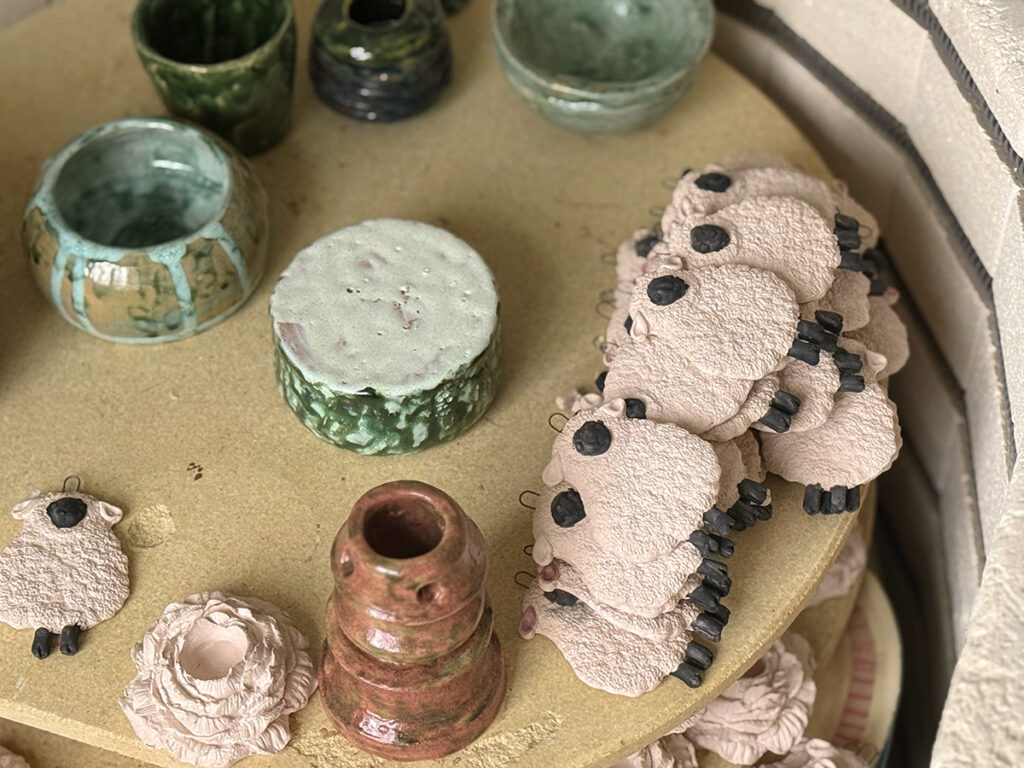 Мария достает из печи кружки, раскрашенные как арбуз (внутри красные в точечку, снаружи – зеленые в полоску), тарелки, подсвечники и заготовки игрушек в виде овечек – символ уже 2027 года.