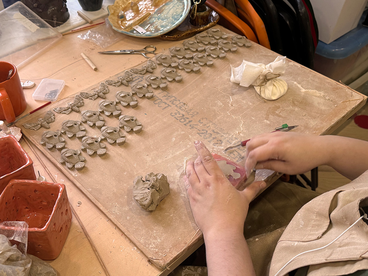 Но «Сундук» старается не фокусироваться только на одном стиле. Работы подопечных самые разные. На полках лежат как милые керамические игрушки в форме лошадки-качалки, так и необычная подвеска в виде мозгов. А Саша в день нашего приезда работала над бражниками с черепами на спинке.