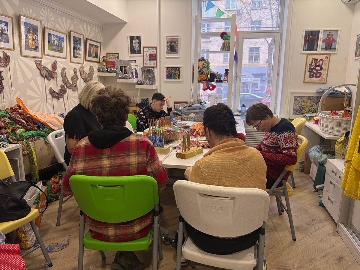 Проходящий мимо молодой человек здоровается с Марией и внимательно вглядывается в нас – «чужаков». В мастерской заняты молодые и взрослые люди с ментальной инвалидностью. Всего тут более ста подопечных: кто-то ходит два раза в неделю, кто-то – чаще. Причем приезжают в «Сундук» даже из Подмосковья – есть подопечные из Королева и Краснознаменска.