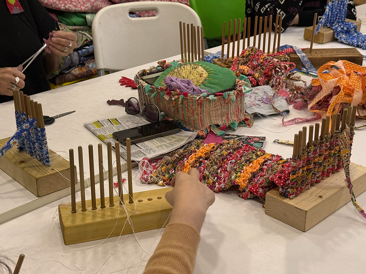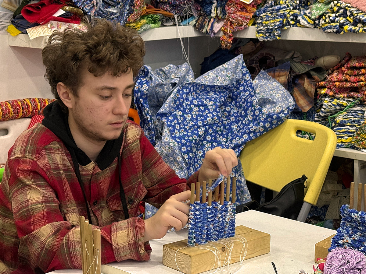 Мы с Марией заходим в небольшую, но плотно заполненную людьми комнату. Это ткацкая мастерская, где под руководством мастера-наставника Елены Мельниковой несколько парней и девушек занимаются ткачеством.