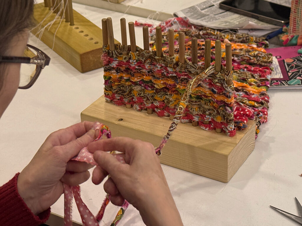 Они работают на специальных ткацких станках. Они выглядят как деревянная основа, в которой ровным рядом на одинаковом расстоянии стоят несколько круглых палочек. Задача мастеров — оборачивать ткань вокруг этих палочек в шахматном порядке.