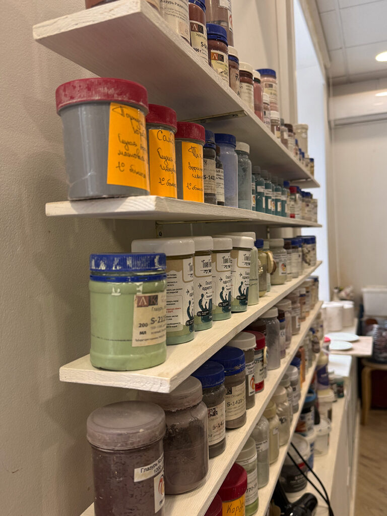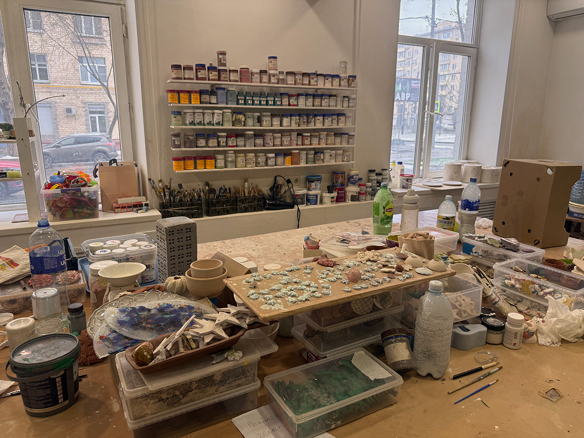 В момент нашего разговора в коридоре из соседней мастерской доносится мужской голос: «А кто это там?» Мария заглядывает, машет рукой и проходит внутрь, приглашая за собой. Мы попадаем в одну из самых просторных мастерских – керамическую.