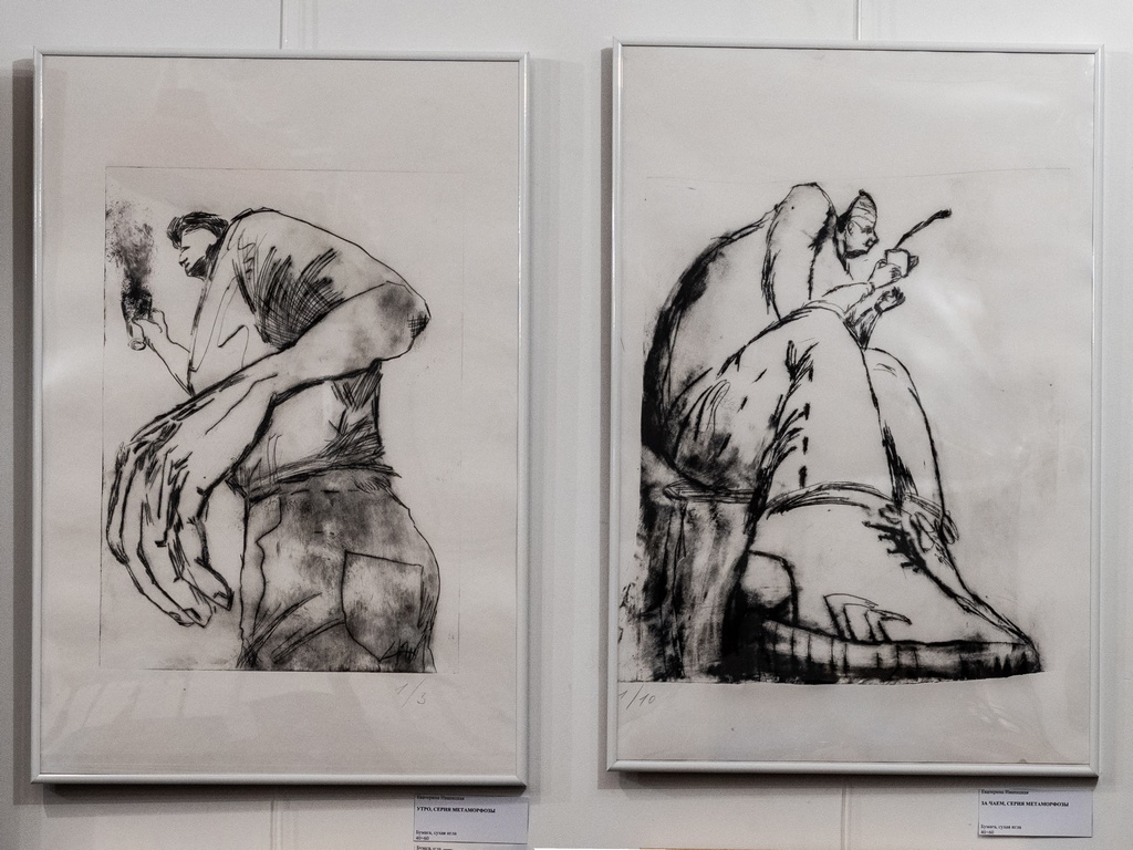 «Мне очень понравилось изображать людей не так, как многие это любят — что называется ”с рабочей стороны”, красиво и идеально, а немножко трансформированно, нестандартно, показывая, что, даже если сторона не совсем рабочая, это все равно прикольно», — рассказывает Екатерина Иваницкая. На выставке представлены две ее работы из серии «Метаморфозы».