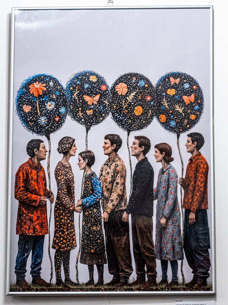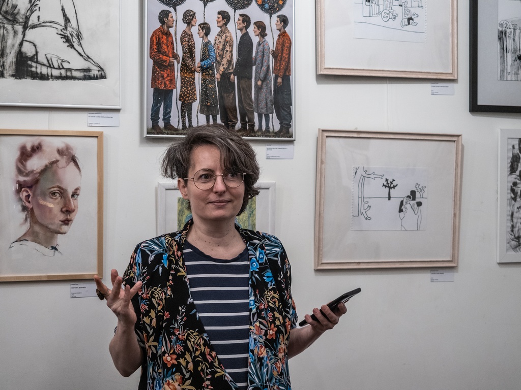 Представленные в экспозиции ее работы — это лица, которые она выхватывает из толпы и рисует, пока едет в метро. «Мне очень понравился посыл выставки, — говорит художница. — Потому что головы похожи на зернышки, и когда я их рисую, то стараюсь уловить характер каждого человека».