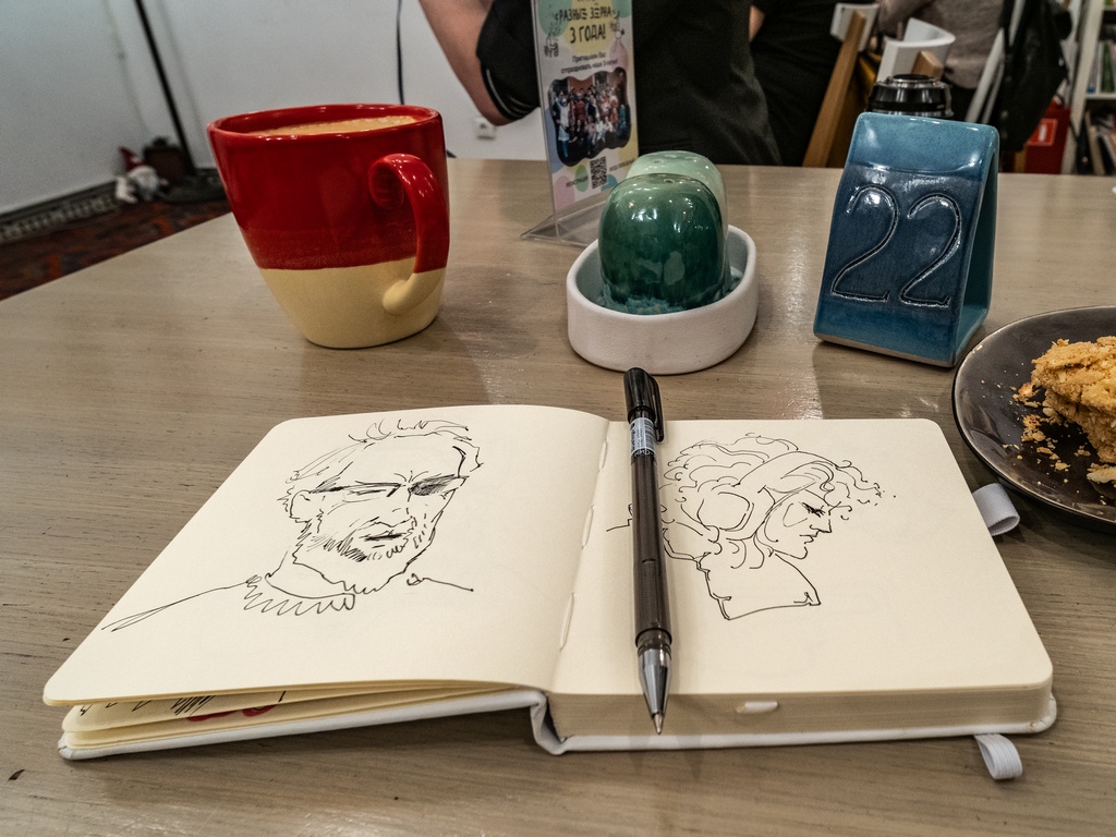 У участников проекта еще до открытия выставки была возможность познакомиться с кафе. В период подготовки к ней прошло несколько пленэр-сессий, на которых художники рисовали жизнь заведения.