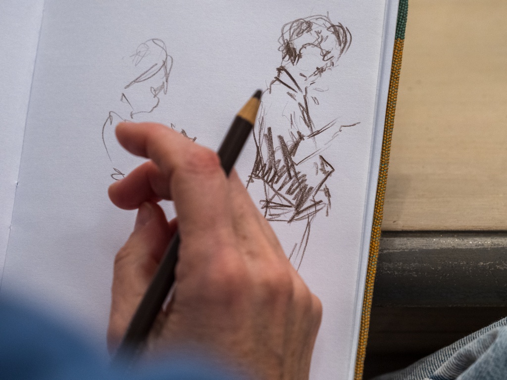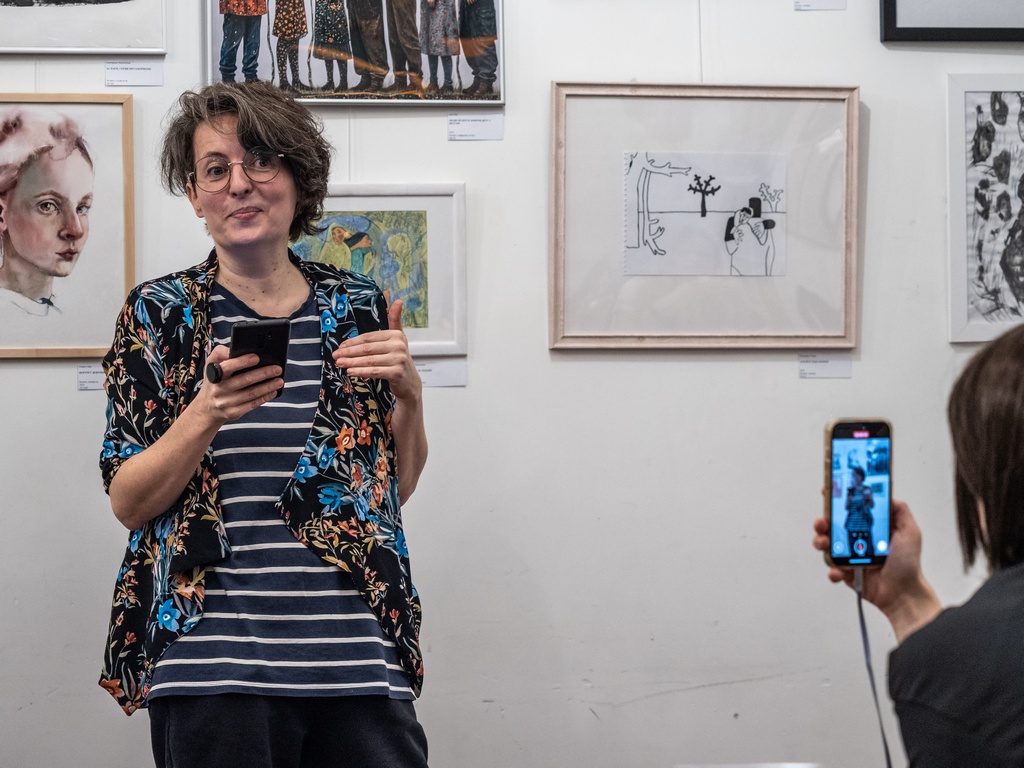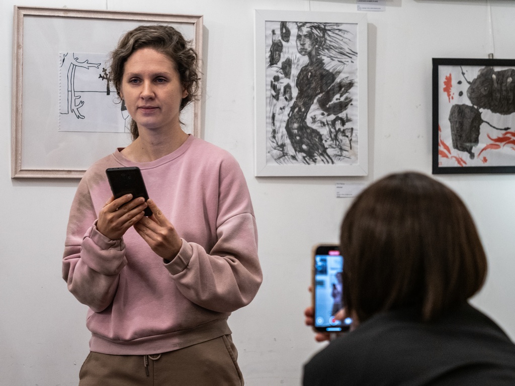 Елена Мельникова рисует всегда и везде, вот и во время открытия выставки ее блокнот заполнялся очень быстро. «Не знаю, может быть, это попытка стресс преодолеть, потому что на самом деле в людных местах мне не очень комфортно. Ну и в принципе рисование мне просто доставляет удовольствие», — поясняет Елена.