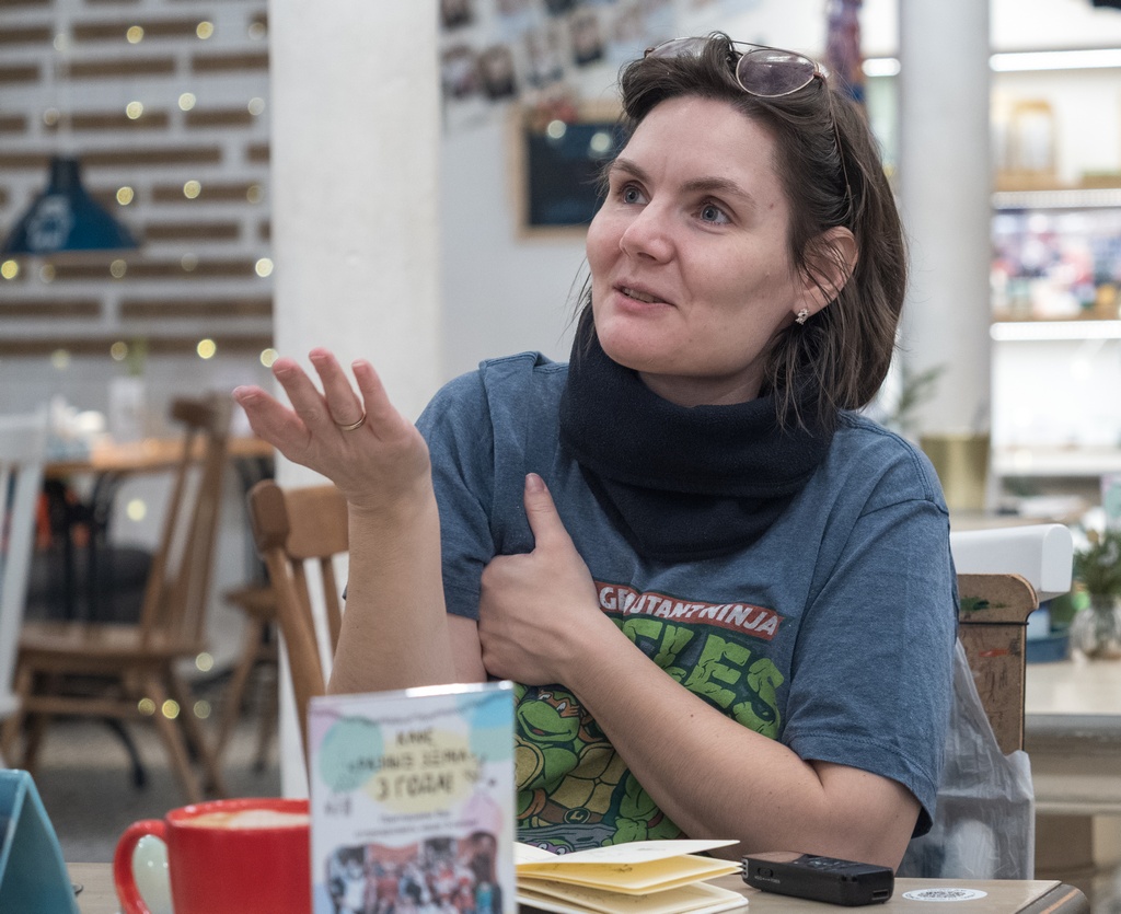О кафе, как и большинство участников, она до опен-колла не знала. Впервые попала сюда накануне открытия экспозиции: «Здесь невероятно! — говорит она. — Очень домашняя атмосфера… Я прибежала просто работы поставить, а мне захотелось задержаться, на вот этот диван сесть, все поразглядывать, потрогать. Я взяла кофе, потом взяла еще чай, мне уже надо на следующую встречу, а я все уйти отсюда не могу… Что за магия?»