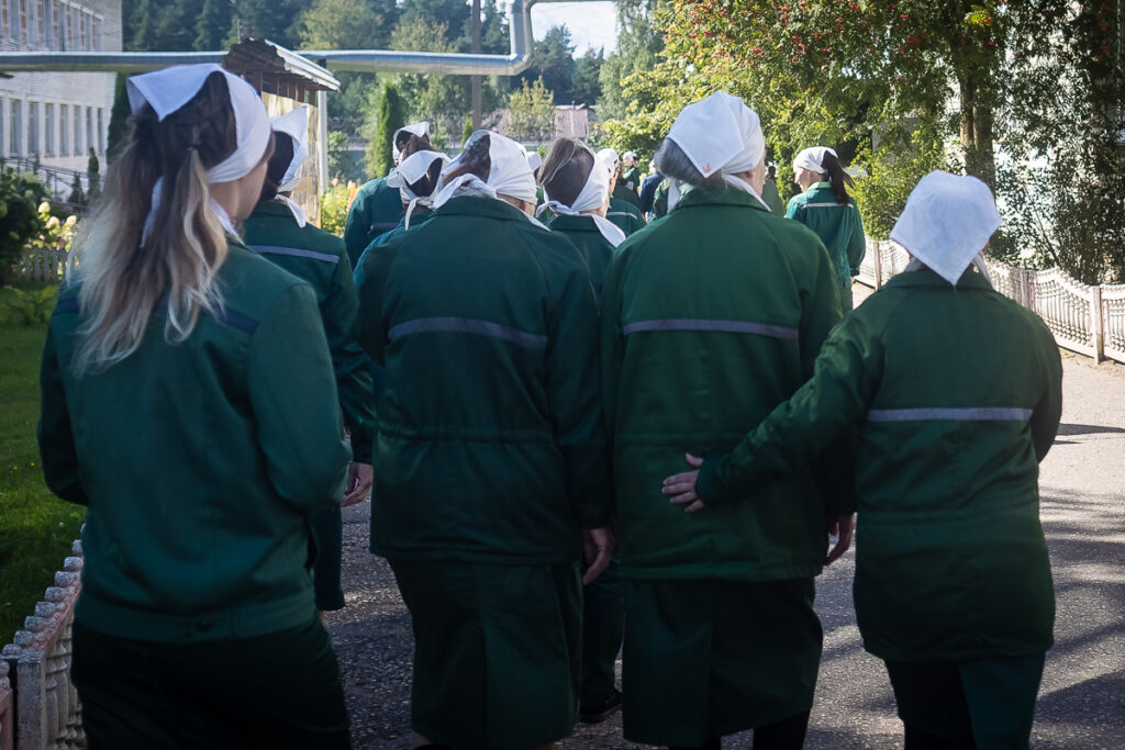 ”Тут все по распорядку, работа шесть дней в неделю. Встала, 10 минут умыться, 10 минут одеться, пошла в столовую, поела, вернулась, сходила в туалет, пошла на работу, отработала… При этом у большинства “первоходов” социальные связи хорошие, мамы-папы, мужья-дети остались. И если на эту тему разговариваешь, спрашиваешь, как дела, откуда сама, они плакать начинают”».