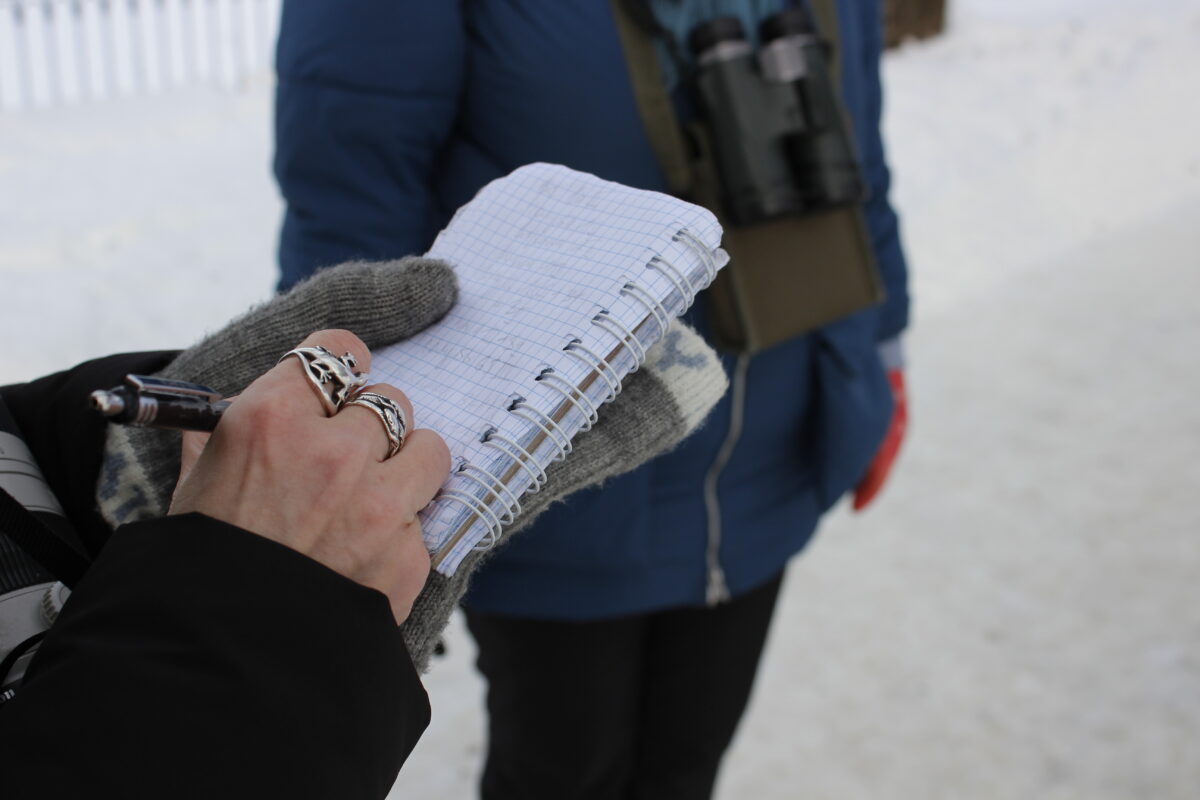 Наталья делает первые пометки карандашом. Блокнот, говорит она, на зимних учетах надежнее смартфона, который может разрядиться на морозе. А карандаш – надежнее ручки, потому что та тоже может замерзнуть или потечь, если бумага намокнет от осадков. Некоторые бердвотчеры (любители, наблюдающие за птицами. – Прим. АСИ) наговаривают наблюдения на диктофон. Это тоже удобно, чтобы не снимать перчатки для записей.