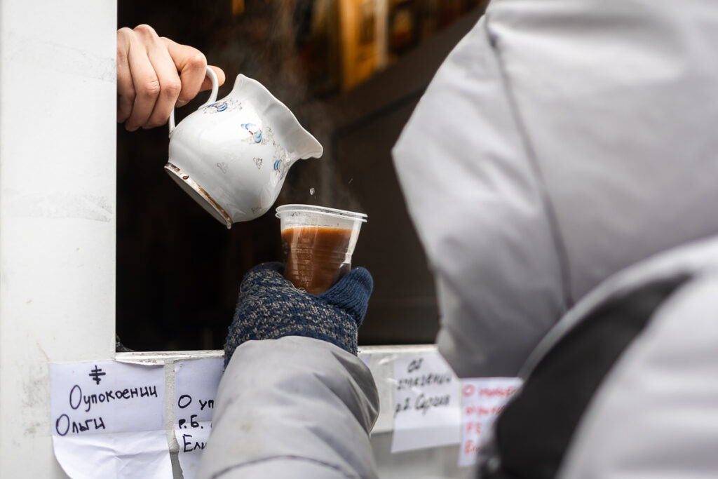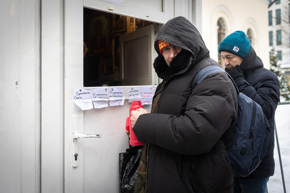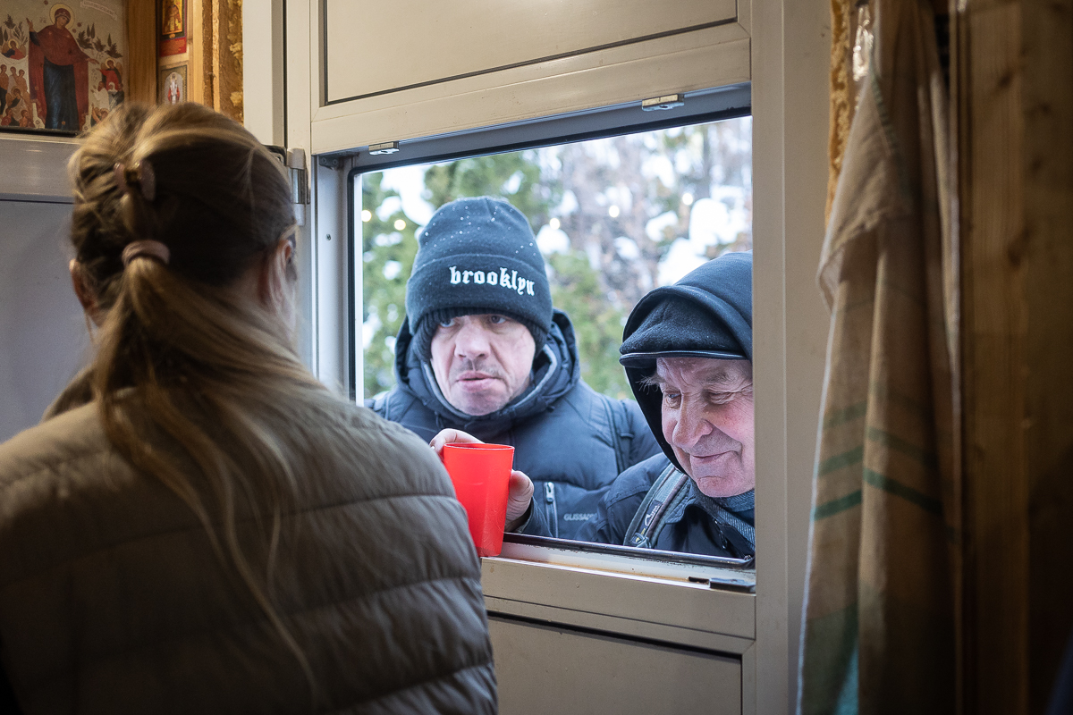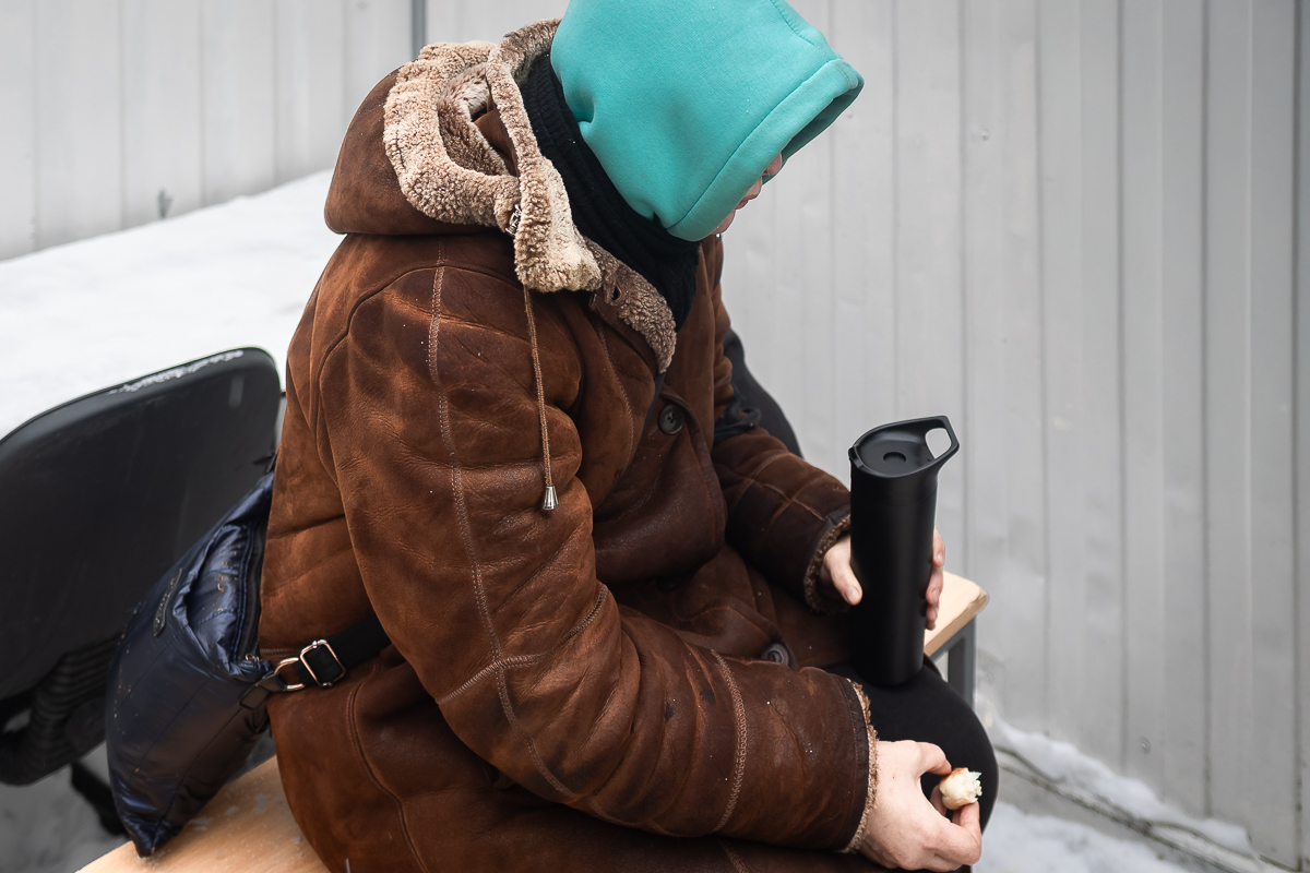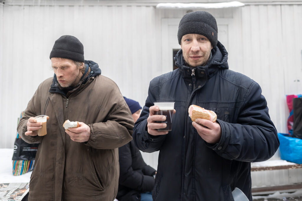 У вагончика можно встретить тех, кто ходит сюда из года в год, многих тут уже хорошо знают. Знают, кто бросает пить, устраивается на работу, а потом снова срывается. Кто может, взяв здесь новые перчатки и носки, тут же попробовать продать их прямо за оградой. Кто, попив чай-кофе с бутербродом, сразу пойдет к алкомаркету стрелять деньги на бутылку.