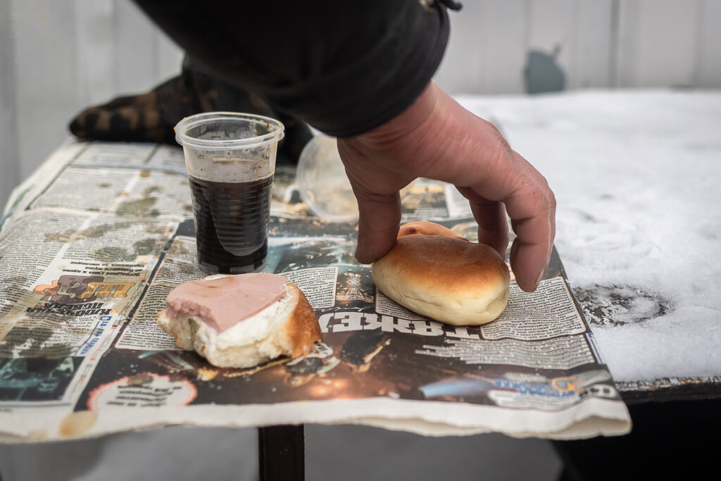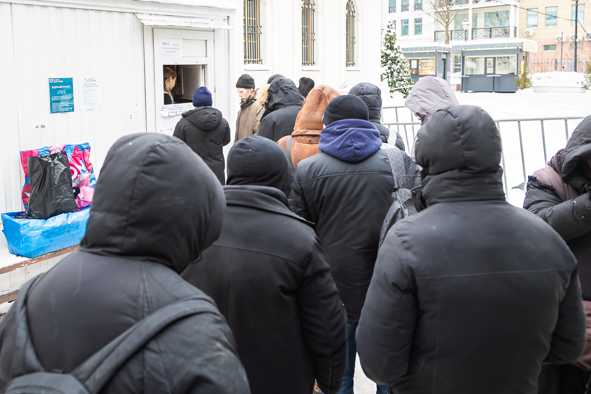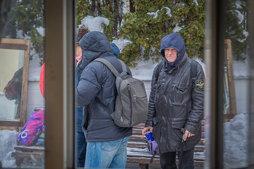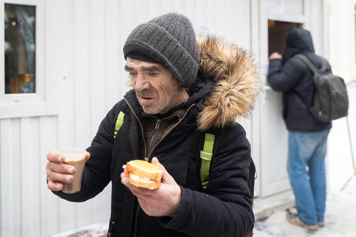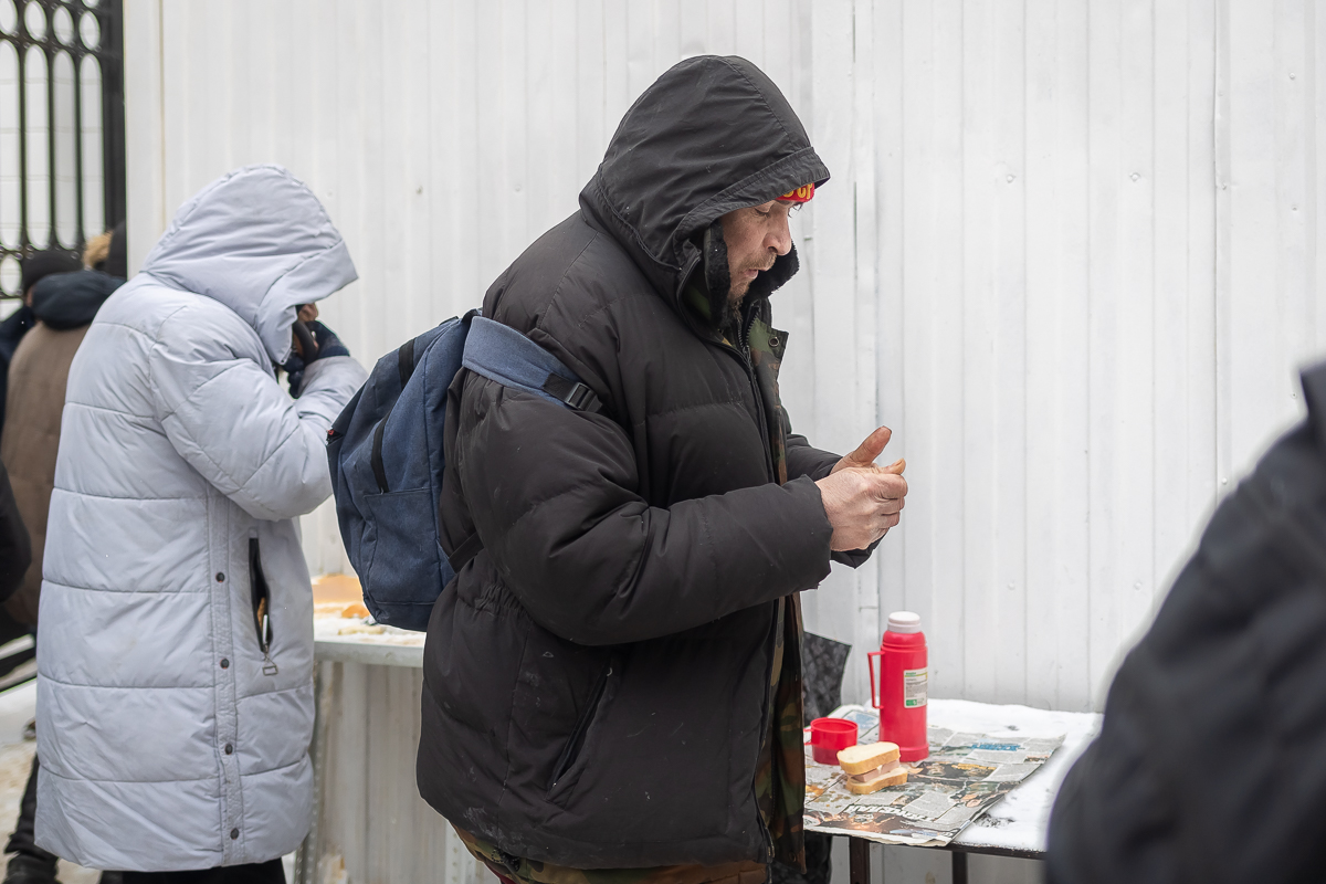 «Колбаса серая! И очереди искусственно создаются», – бормочет пожилой мужчина, ждущий свой бутерброд. Крупный молодой мужик в одном свитере рядом требует, чтобы ему выдали верхнюю одежду. Но курток не только его размера, но и вообще сегодня нет. Он злится и матерится. Ответственный за вагончик Александр Галкин выводит его за ворота. «Бывает, – говорит, – куртку за оградой снимут и сюда идут просить».