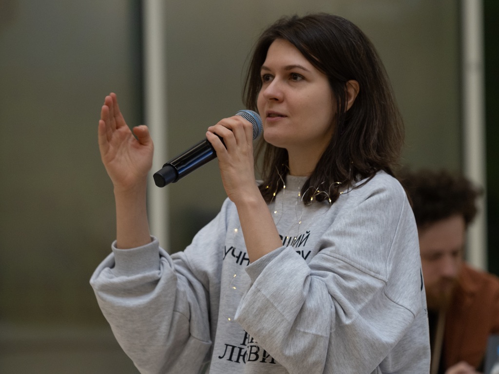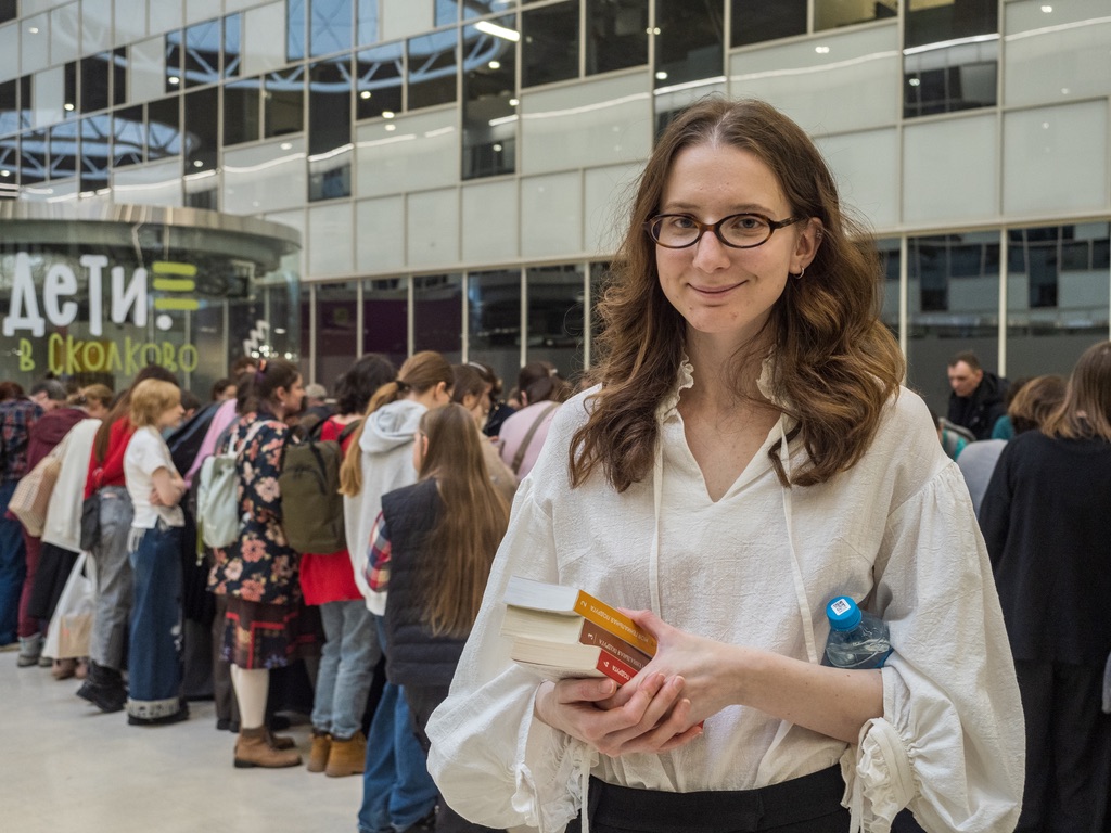 Ксения Прихотько, филолог и блогер, раньше только приносила и покупала книги, а в роли волонтера-спикера на фестивале — впервые. Для этого она специально приехала из Петербурга: «Решила, что 14 февраля надо как-то осмысленно провести и сделать что-то хорошее, посвященное любви к книжкам», — говорит Ксения.