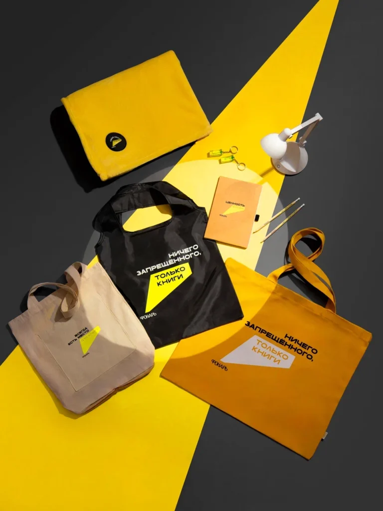 Благотворительный книжный фестиваль «Фонарь» выпустил первую цельную линейку мерча. Вместе с креативным агентством Arnika gifts design и поставщиком Oasis организаторы создали сумки, пледы, блокноты, карандаши, брелоки и лампы.