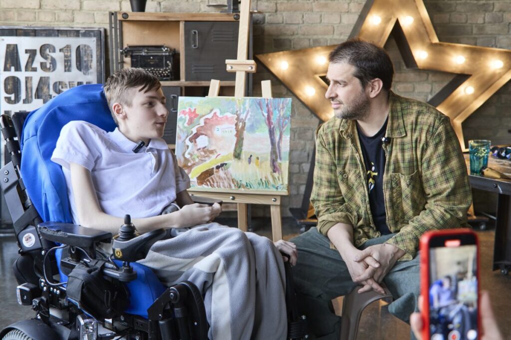 Над картиной склонился подопечный фонда Стас и его взрослый помощник — музыкант Петр Налич. По задумке проекта, холст разделен на две части: на одной уже есть скетч, нарисованный ребенком. После ее закрывают и передают взрослому. Взрослый, видя только окончания линий заготовленного скетча, должен продолжить его на свободной части холста. Затем паре вместе необходимо раскрасить картину полностью.