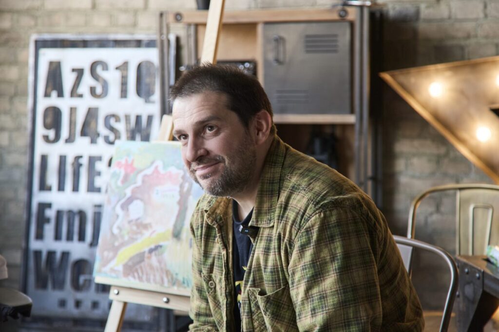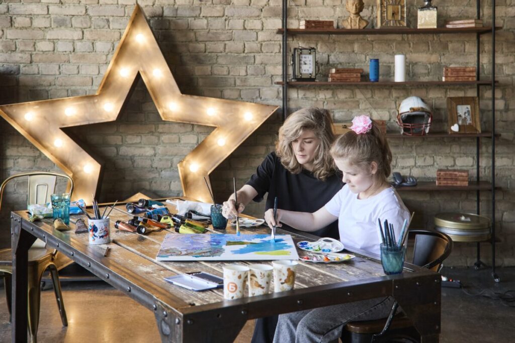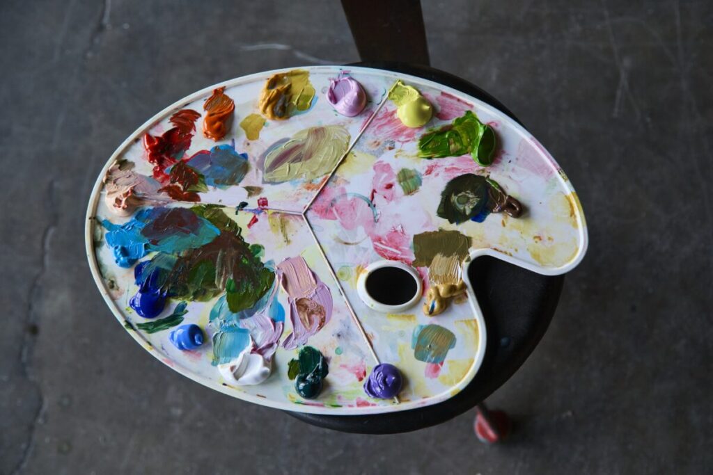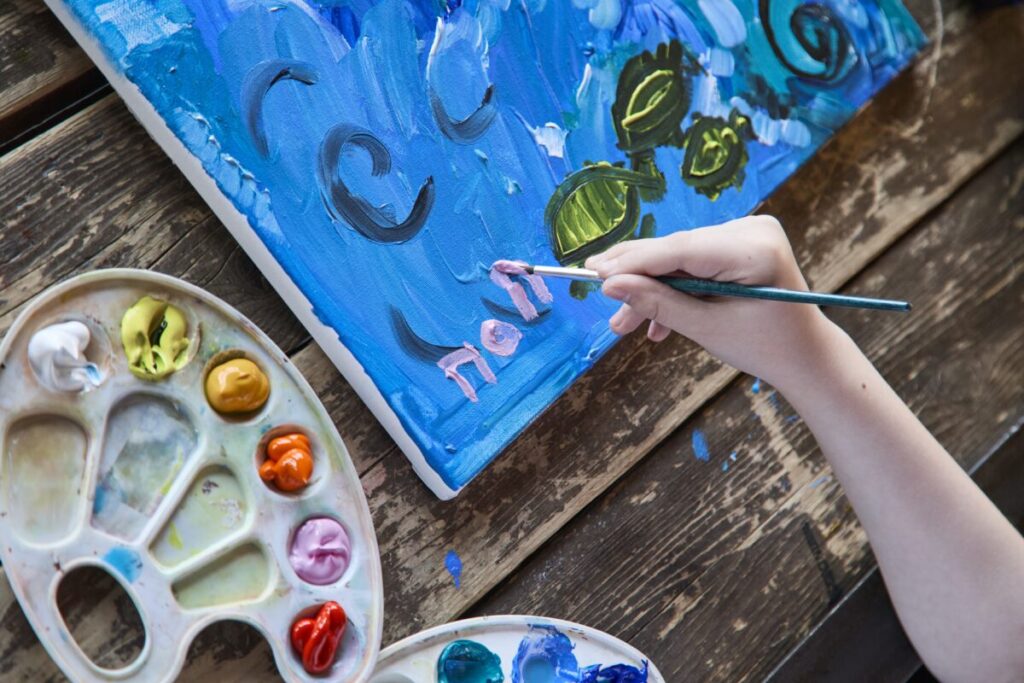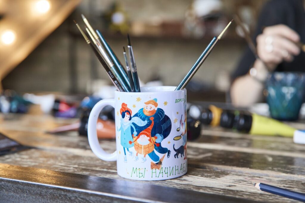 На большом деревянном столе — тюбики с акриловыми красками всех цветов радуги, рядом стаканчики, полные кистей разной толщины. Палитры уже испачканы разноцветными мазками — процесс шел полным ходом.