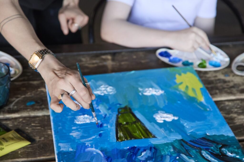 Совместную картину пара назвала «Морское искусство»: на холсте, оставленном сушиться, выделялось горлышко бутылки, которая стала извергающимся вулканом, а все полотно вокруг — морем.