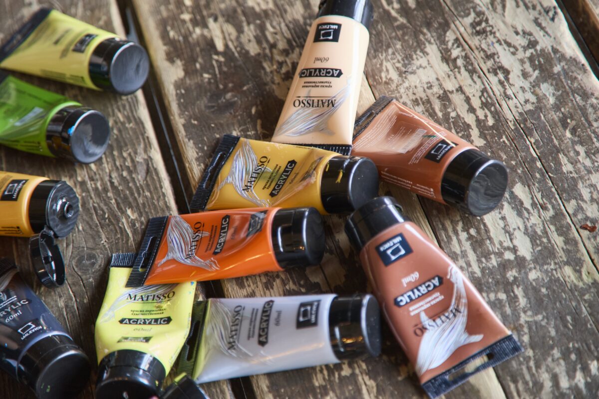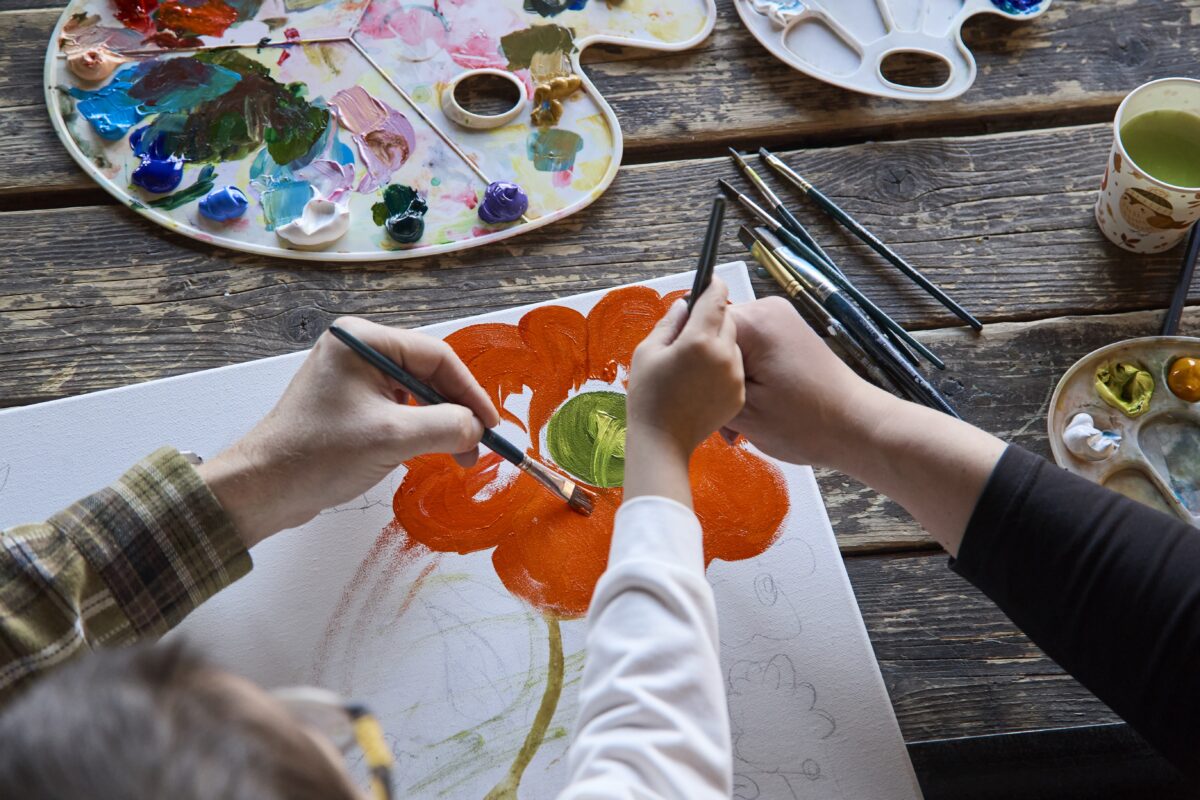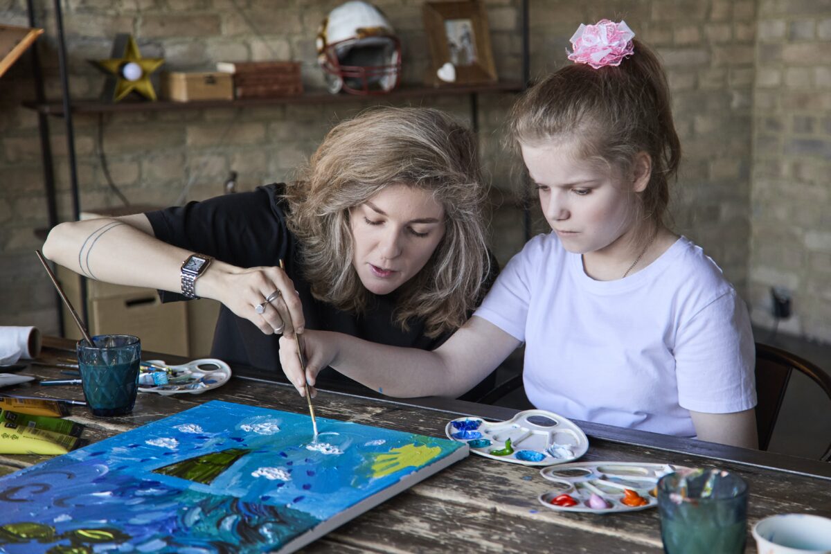 На большом деревянном столе — тюбики с акриловыми красками всех цветов радуги, рядом стаканчики, полные кистей разной толщины. Палитры уже испачканы разноцветными мазками — процесс шел полным ходом.