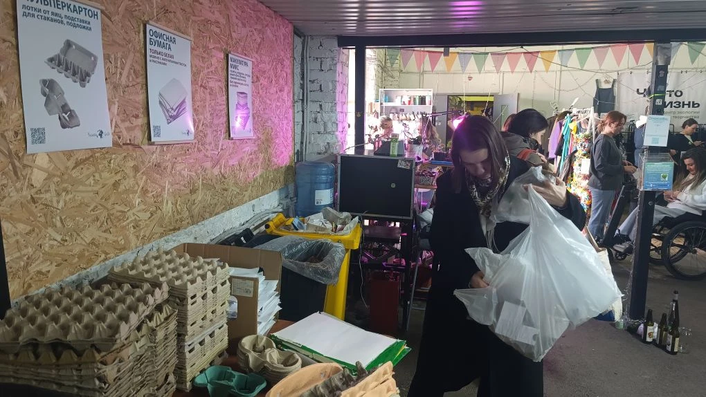 Заходишь — и глаза разбегаются. Справа от входа — кружки ручной работы с неровными краями. Рядом — молодые деревца и баки для раздельного сбора отходов. Чуть дальше женщина объясняет слушателям, почему голубь не опаснее попутчика в трамвае, а за ней другая рассказывает, как оказать первую помощь дельфину, выбросившемуся на берег.