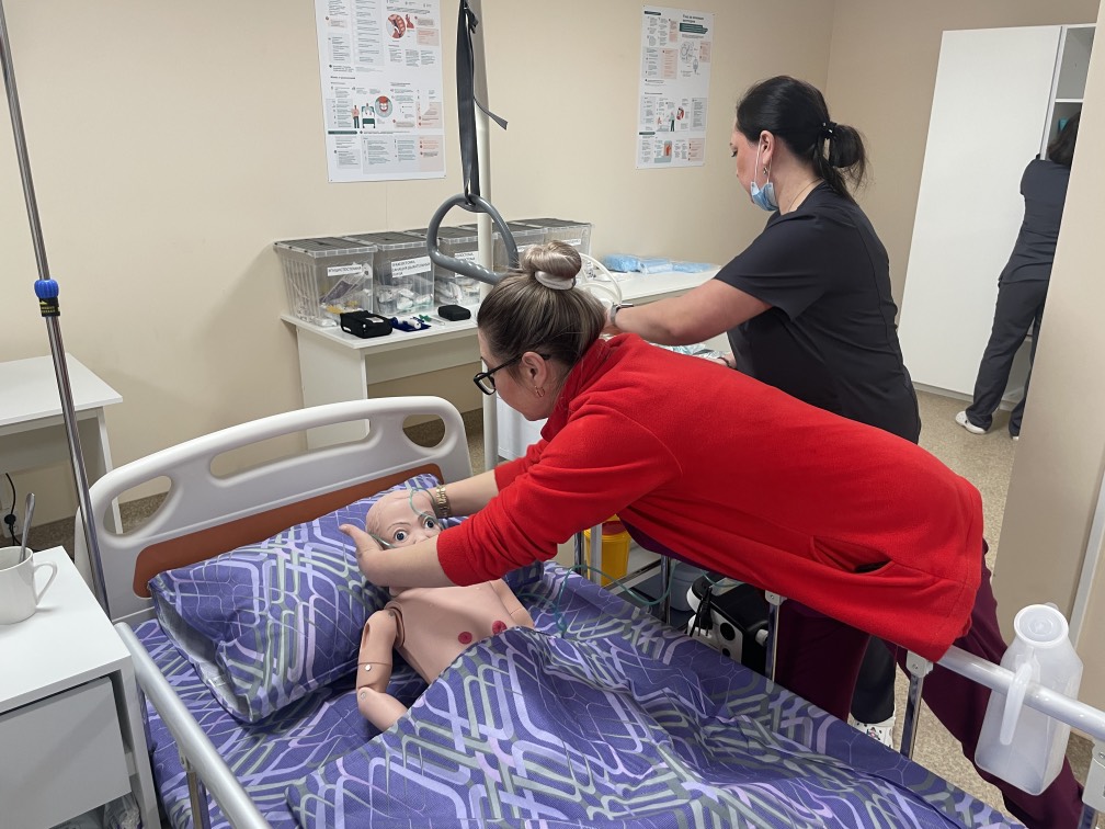 В просторной комнате — две кровати, разделенные ширмой. На одной уже лежит «пациент» — манекен, изображающий ребенка. Вторая кровать пока пуста — взрослый манекен должны привезти в середине апреля, тогда и состоится официальное открытие симуляционного кабинета.