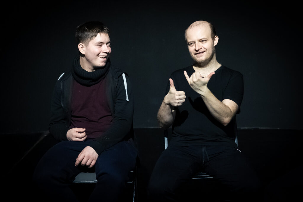 А Витя (Виктор Бодунов – актер Театра Простодушных. Прим. АСИ), наоборот, помнит все спектакли и все роли, он идеальный партнер, который будет подсказывать. Он очень хорошо чувствует сцену, поэтому понимает, когда надо тихо подсказать, а когда можно схохмить.