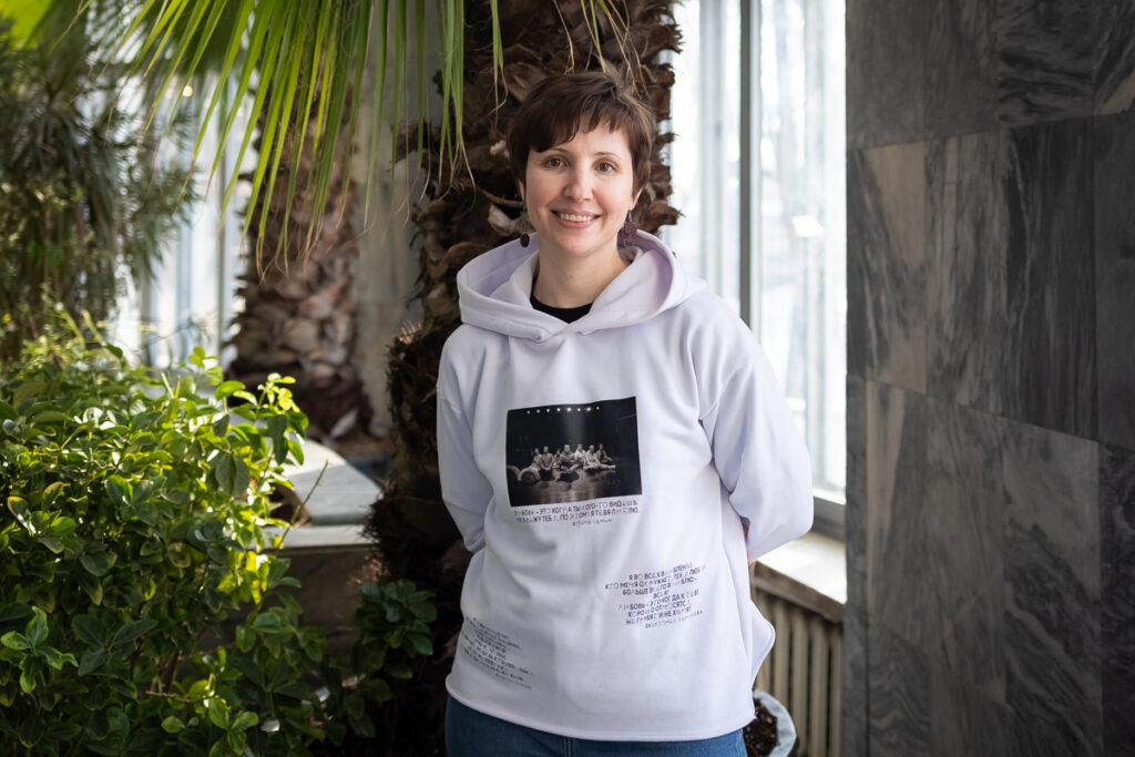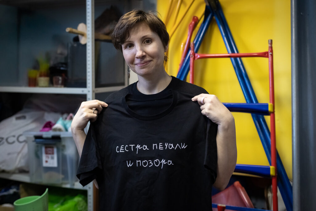 Некоторые фразы из спектаклей у нас на мерче – вышиты или напечатаны специальным «просто_шрифтом» (шрифт, в создании которого участие принимали актеры театра. – Прим. АСИ). Была замечательная волонтерка, которая первый раз сделала такие футболки для маркета, а потом поделилась опытом. Я вообще люблю рукоделие и стала этим заниматься, когда есть время. Если фраза длинная, чтобы вышить ее, надо четыре-пять часов.