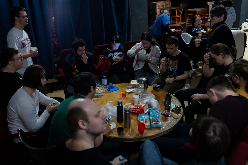 Я стояла возле аудитории, где репетиция проходит, вышел один из волонтеров, говорит: «Вы к нам? Заходите!» Зашла, села в уголочек, посидела, посмотрела. Потом перерыв и чаепитие, я немножко пообщалась с ребятами, водички кому-то налила.