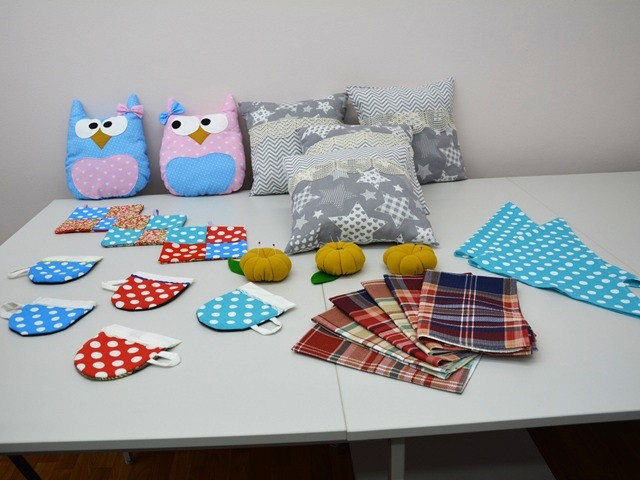 Постепенно участницы осваивают все более сложные изделия. От прихваток перешли к грелкам для чайников, фартукам, косметичкам, жилетам. Сейчас в планах — постельные комплекты, подушки, сорочки, костюмы для спектаклей и мягкие игрушки.
