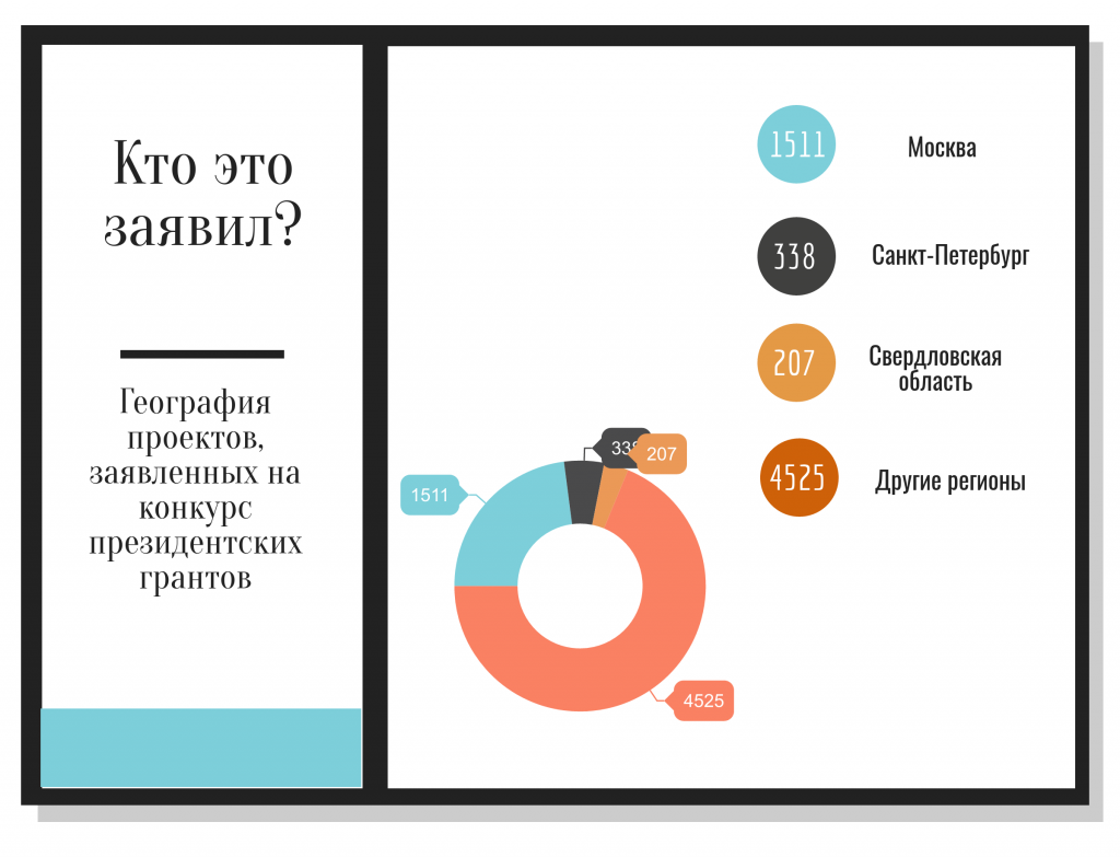 Наибольшее число заявок (1511) было прислано некоммерческими организациями из Москвы, на втором месте оказался Санкт-Петербург (338 заявок), на третьем – Свердловская область (207 заявок).