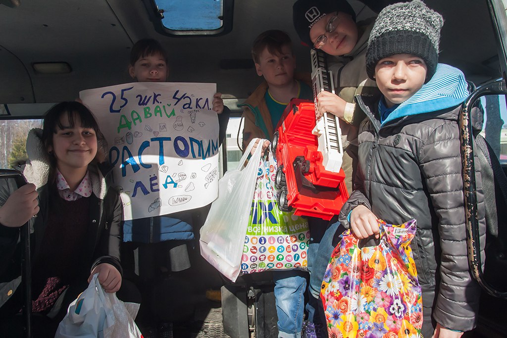 4 апреля волонтеры на специальном автобусе объехали 14 школ города, заехали в детский сад №110 «Красная шапочка» и приняли у участников акции подарки для маленьких детей, оставшихся без родителей. Акция проходила как событие городской программы развития общественной активности младших школьников «Первый шаг в общество», за которую отвечает Юниорский союз «Дорога». База волонтеров – площадка Детско-юношеского центра Петрозаводска.