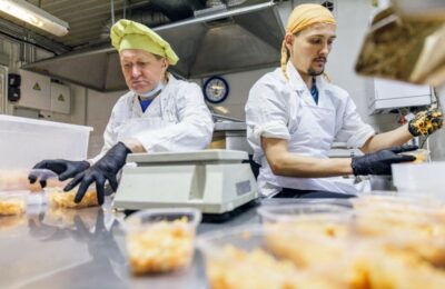 Горячее питание раздают волонтеры фонда, мурманчане Евгений и Евгения Рябковы. Привозится оно из Мурманска, где его тоже готовят добровольцы. Обед традиционно состоит из первого, второго, чая, хлеба и выпечки. Каждый пришедший получает свою порцию, заранее расфасованную в пластиковые контейнеры.